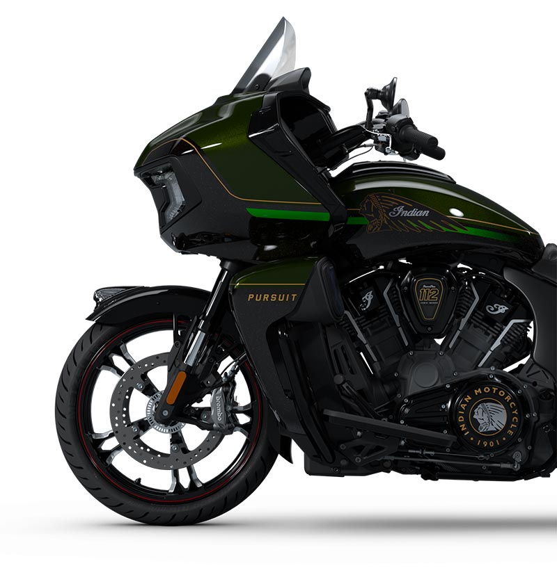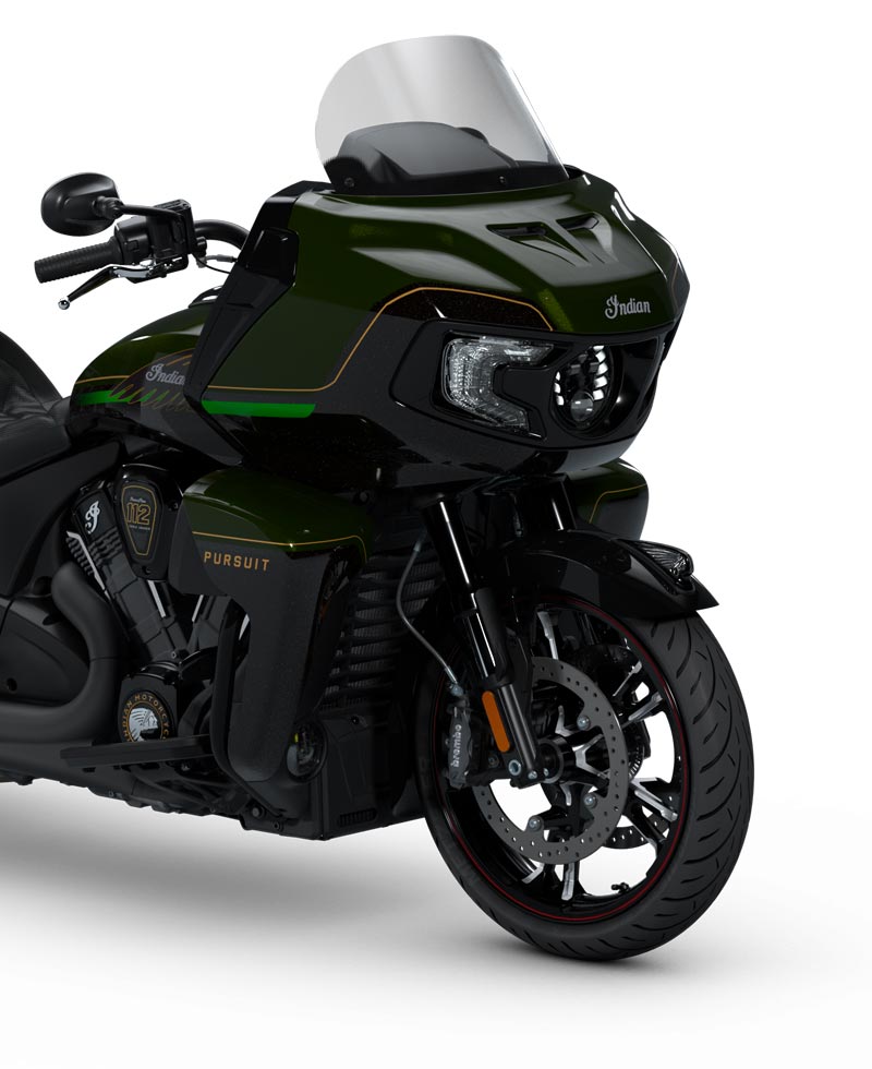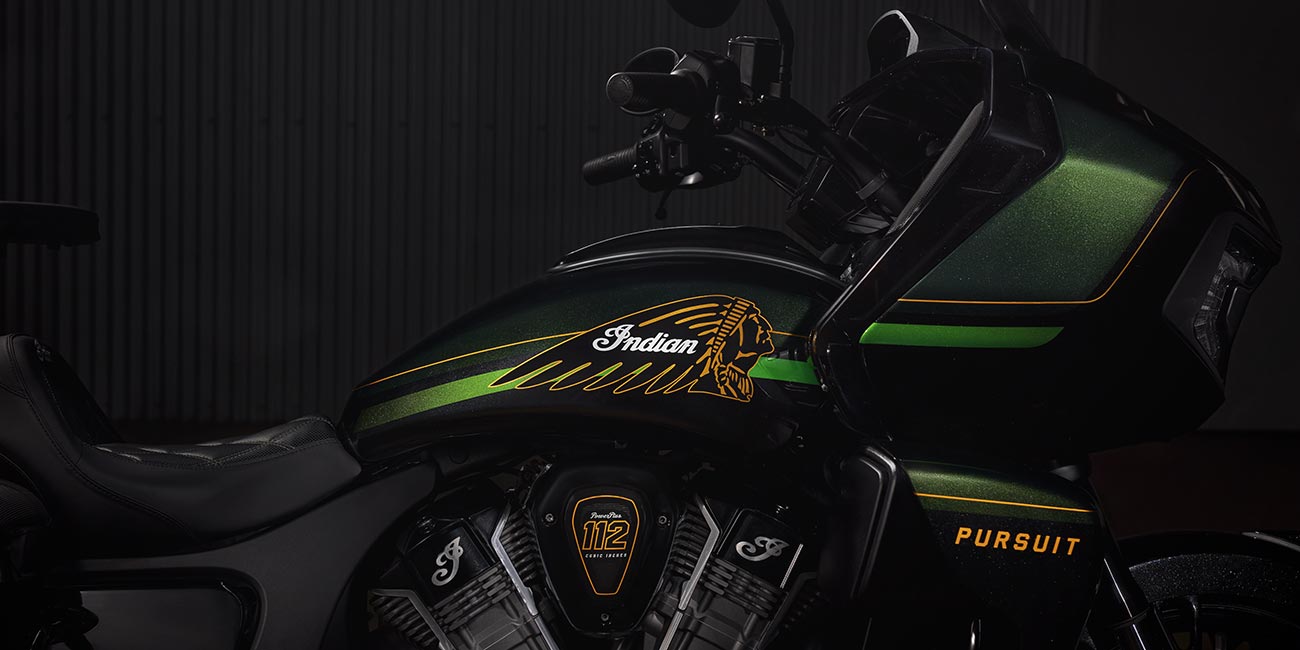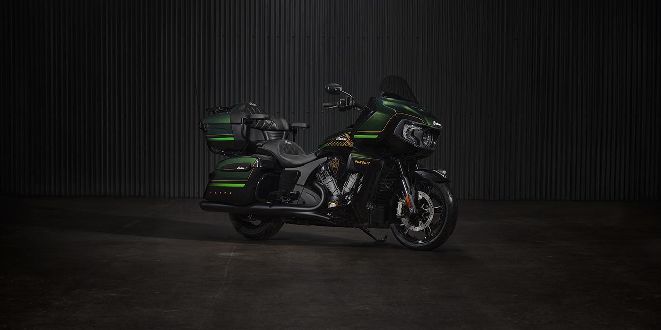 Fernverschliessbare Koffer, elektrisch verstellbares Windschild, 140+ Liter Stauraum, schlüssellose Zündung, verstellbare Verkleidungsklappen, USB-Ladegerät, Reifendruckkontrollsystem (TPMS), Indian Fussbretter für Fahrer und Beifahrer, beheizbare Sitze mit grünen Nähten, beleuchtete Schalter mit beheizten Griffen, Armlehnen für den Beifahrer und Fahrscheinwerfer